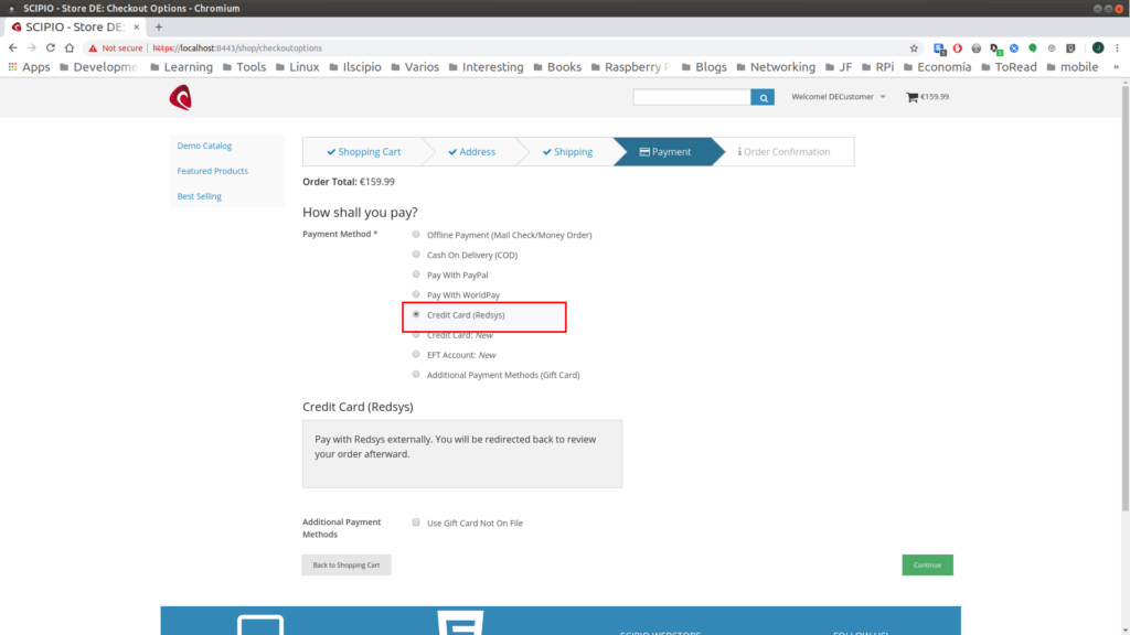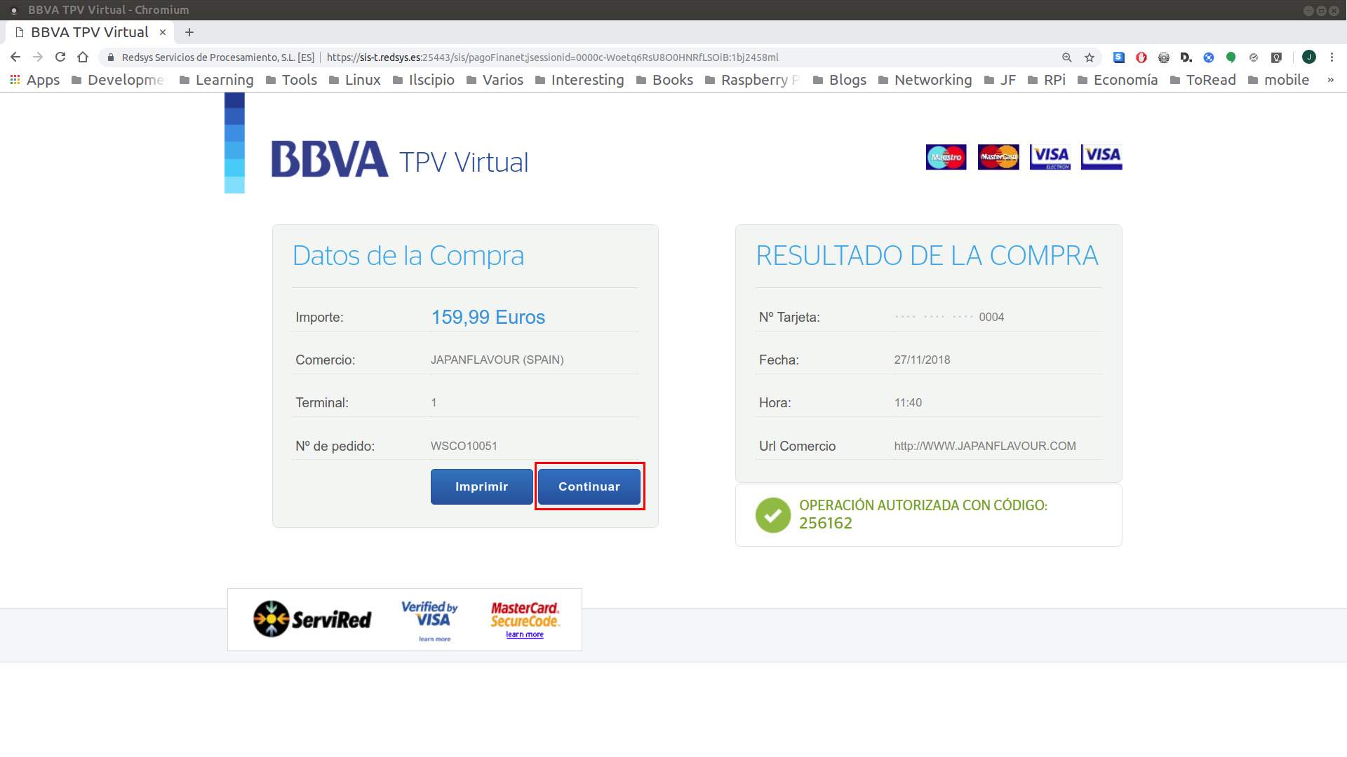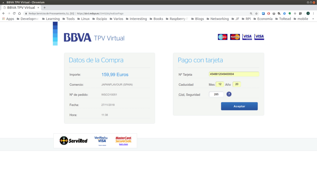 - You’ll be redirected to your bank entity site and it will take care of gathering the payment details. Ultimately Redsys will process and return the result. Use the credit cart info for testing purposes. It should be provided by your bank.