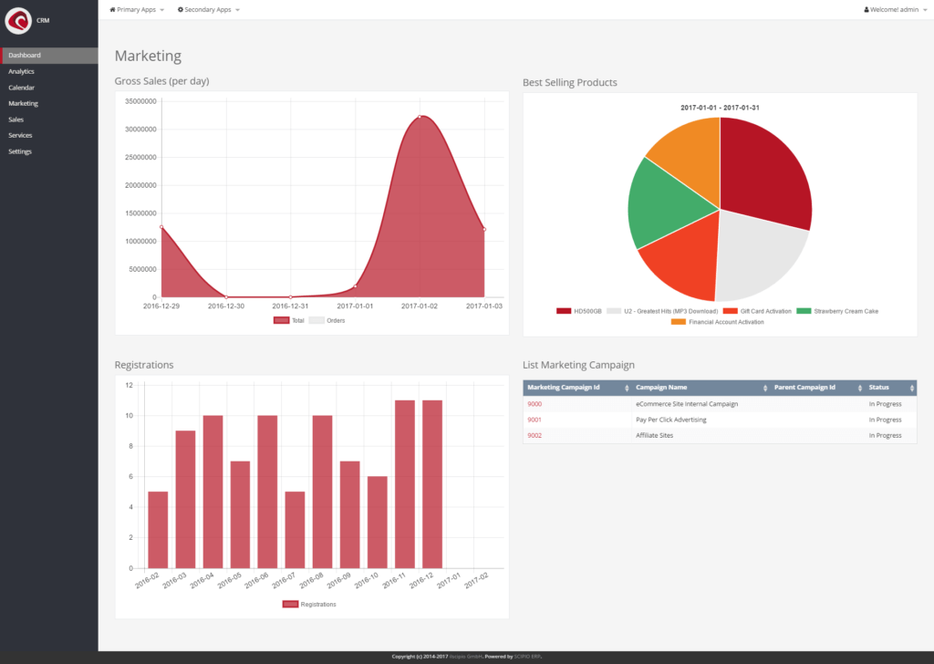 The customer relationship management component is the main hub for the management of all current and potential future customer interactions. The application gives you tools to analyze current sales, customers & leads, as well as organize internal teams & events. As such, the application consists of: