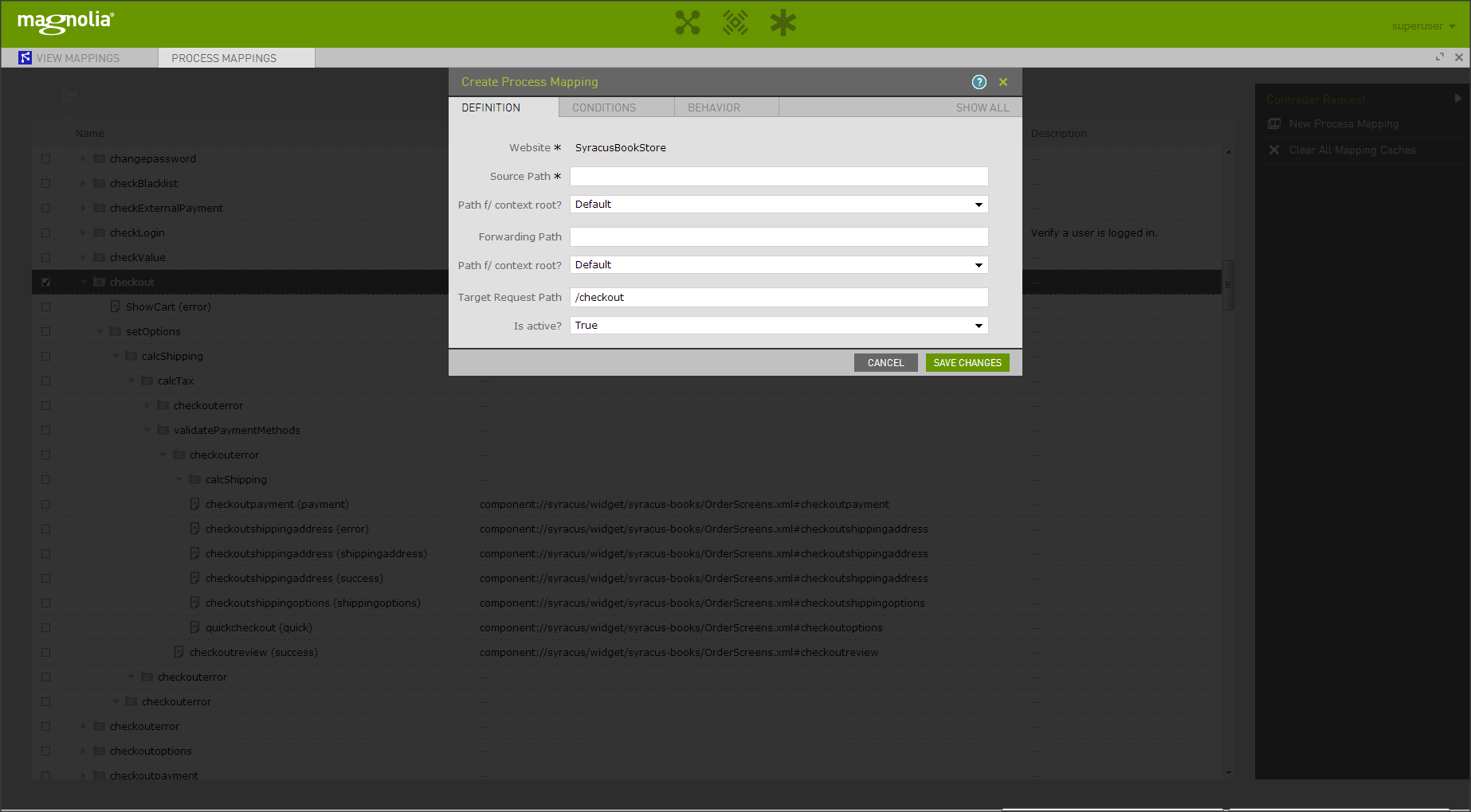 The Scipio ERP process viewer displays the entire request flow in a tree. Reuse existing processes and modify the page results. Want to create a product specifc checkout process with a custom design? Now you can!